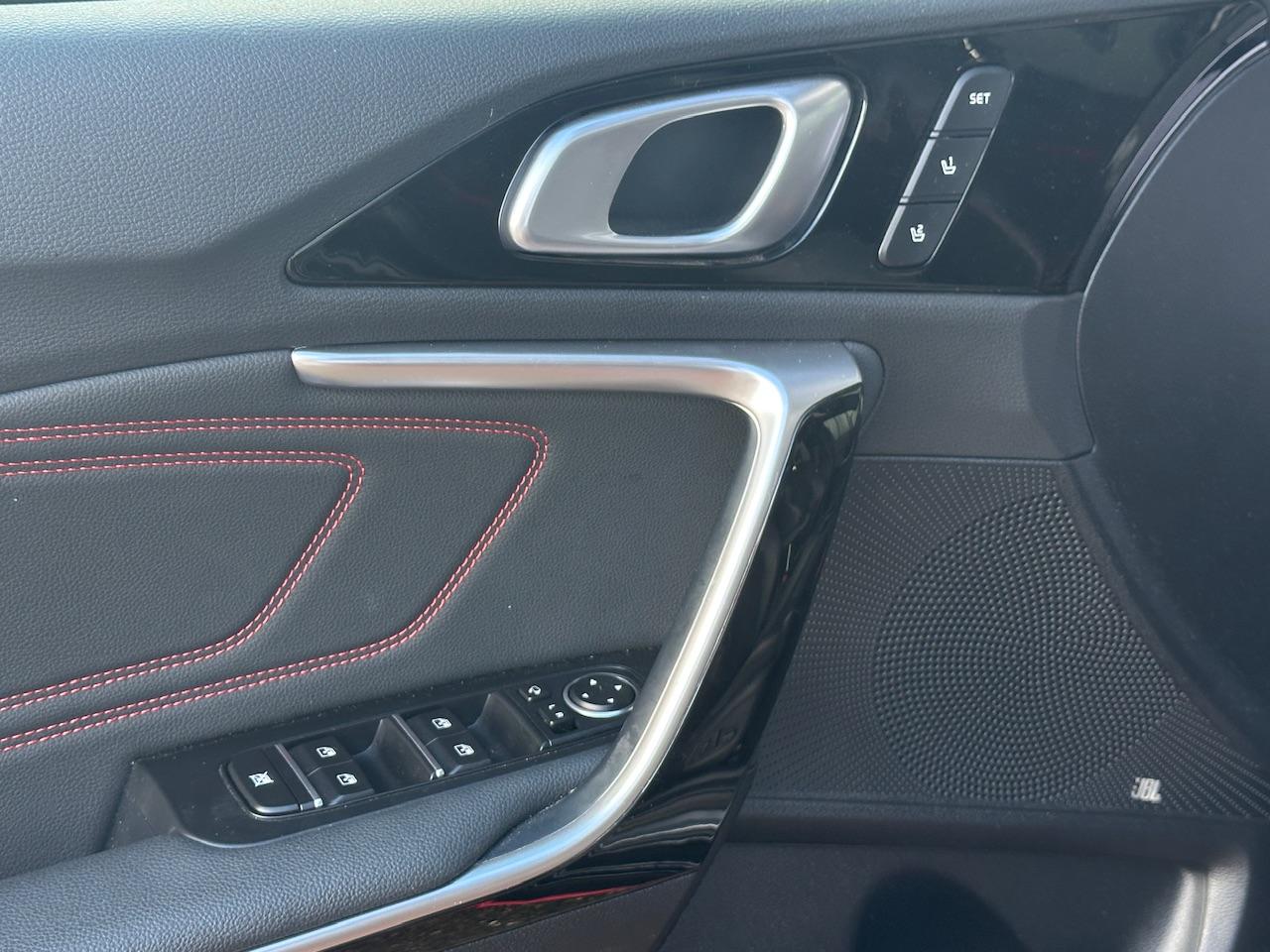 Rode stiksels in stoelen, stuurwiel, versnellingspookhoes, deurpanelen