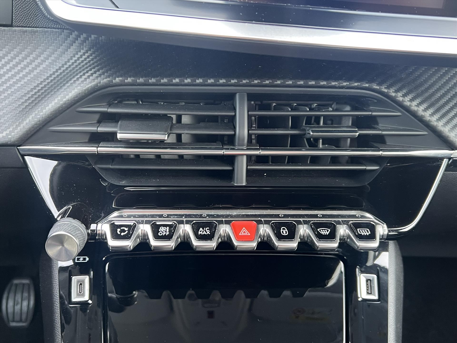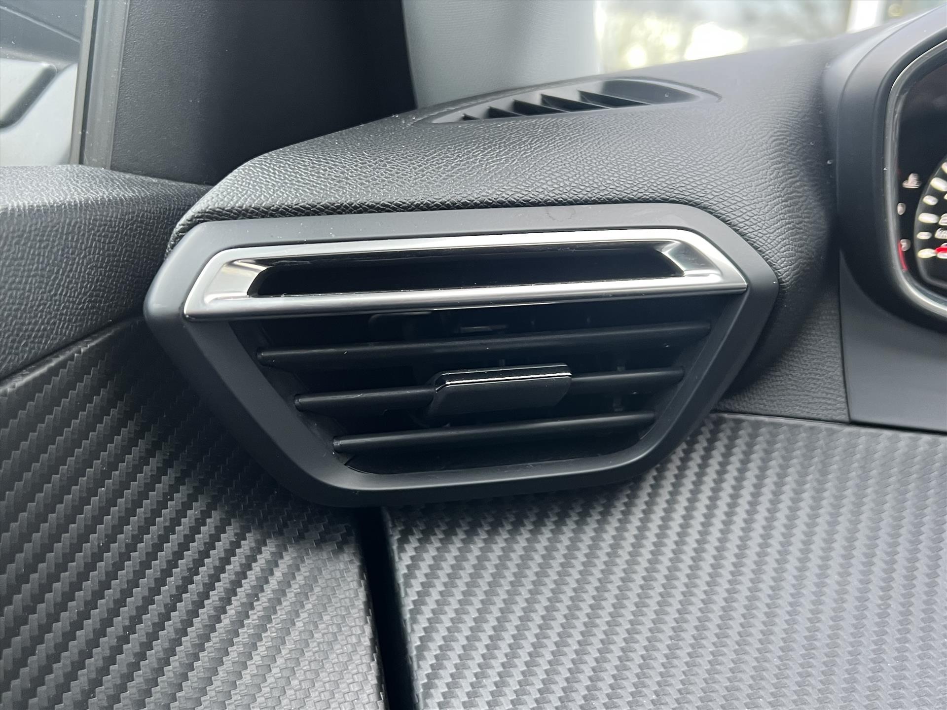 Dashboard in zacht materiaal met carboneffect en hoogglans zwarte sierstrip