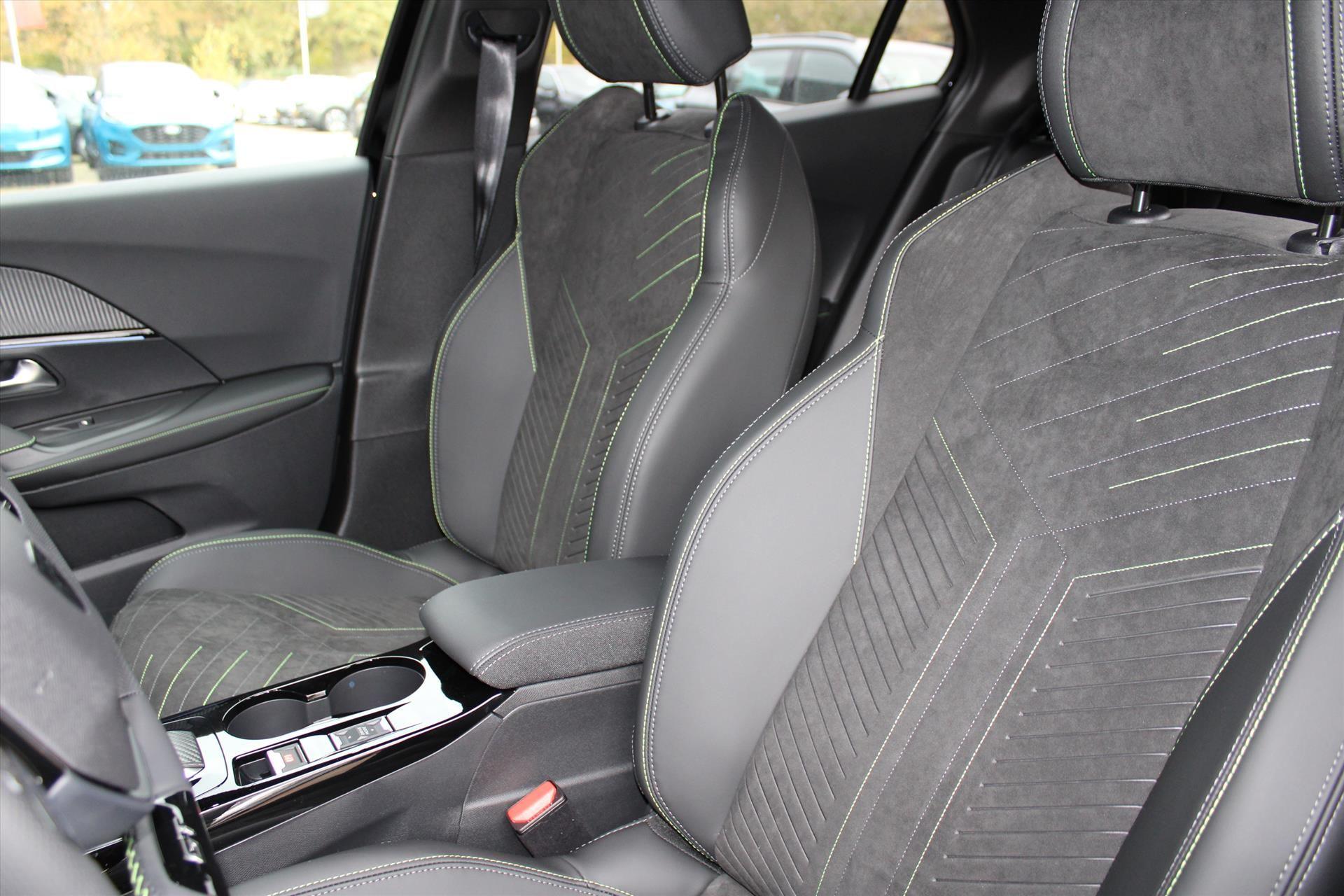 Sportstuurwiel afgewerkt met geperforeerd leder, groen stiksel en GT-logo