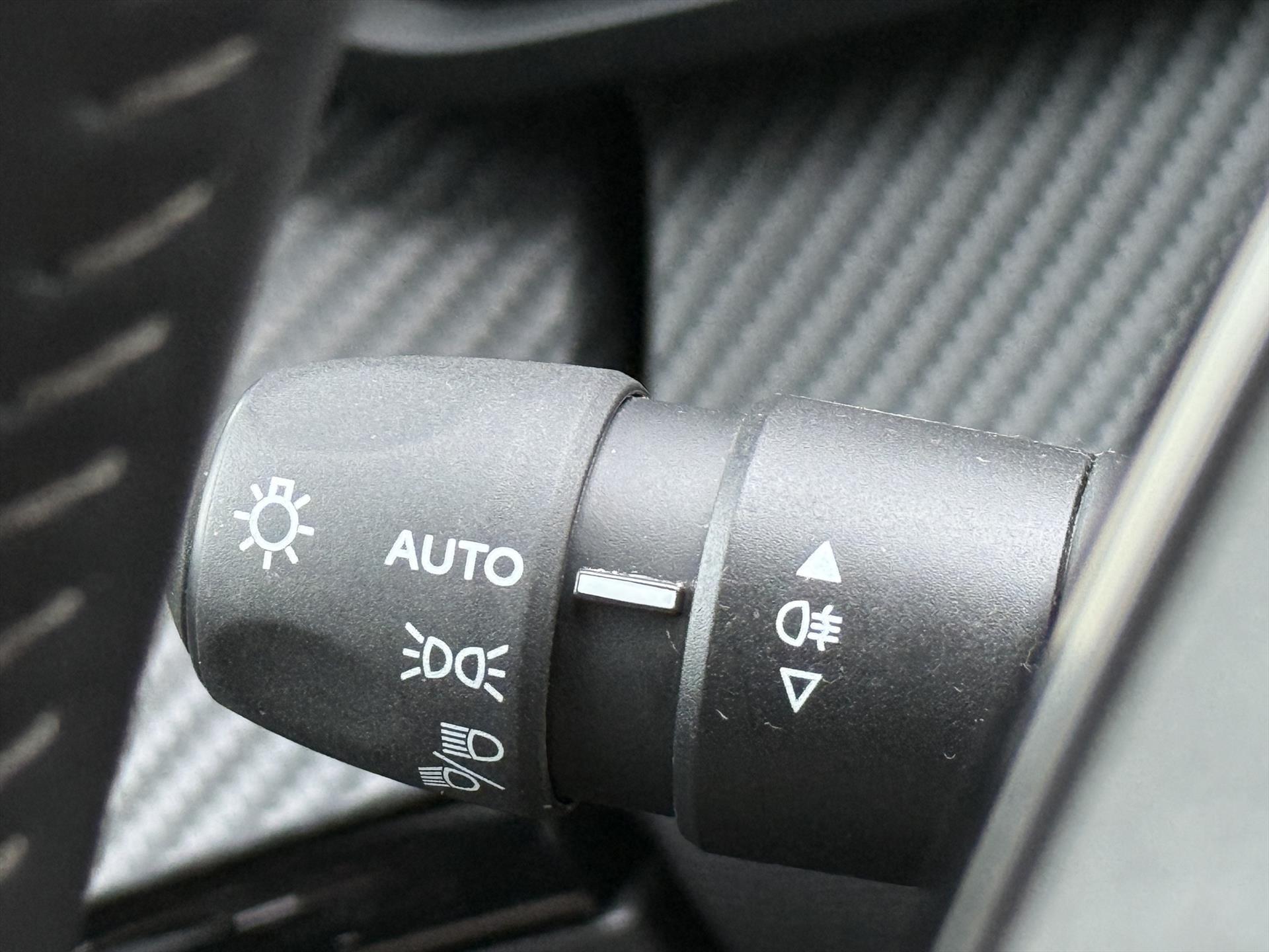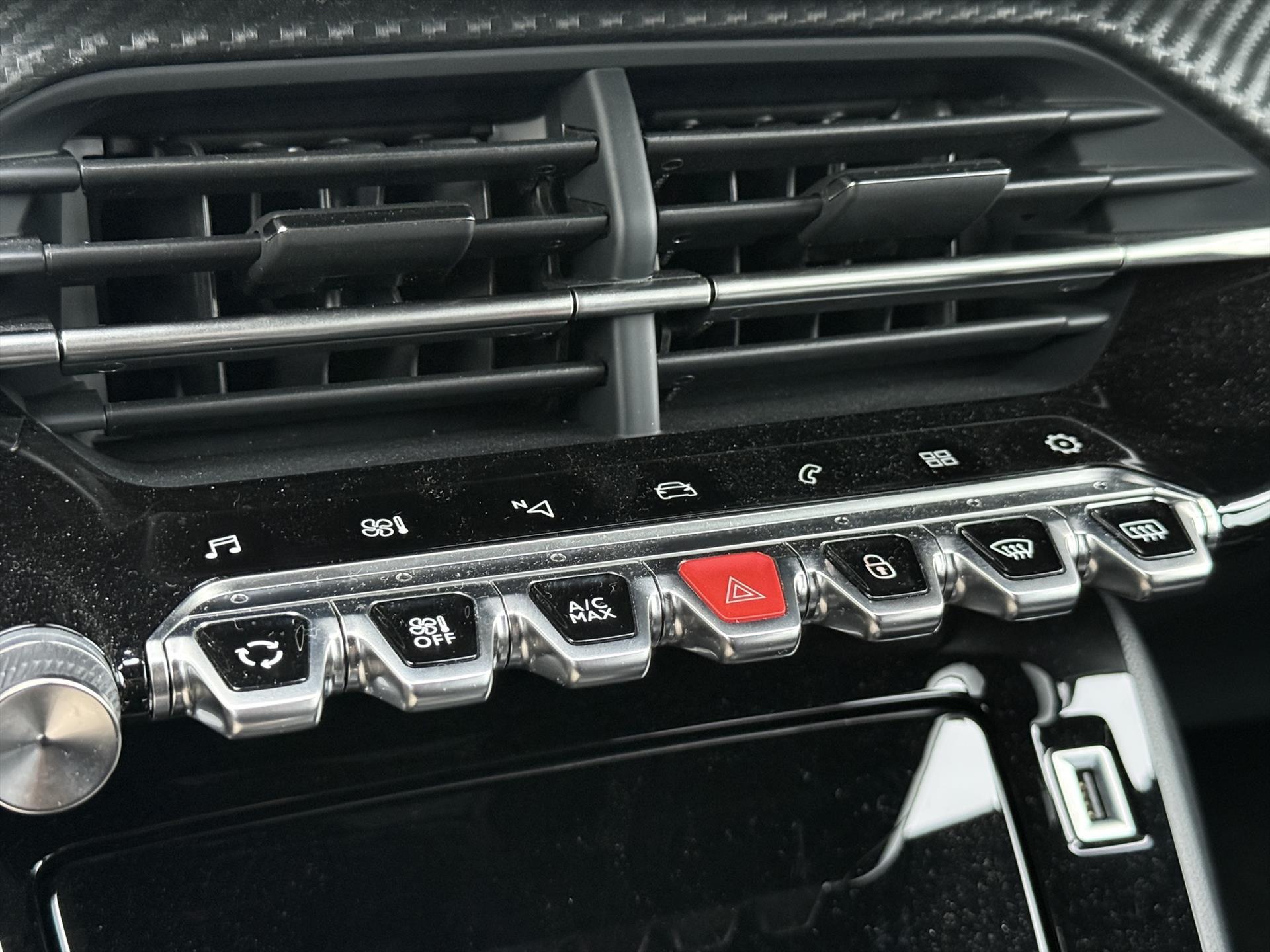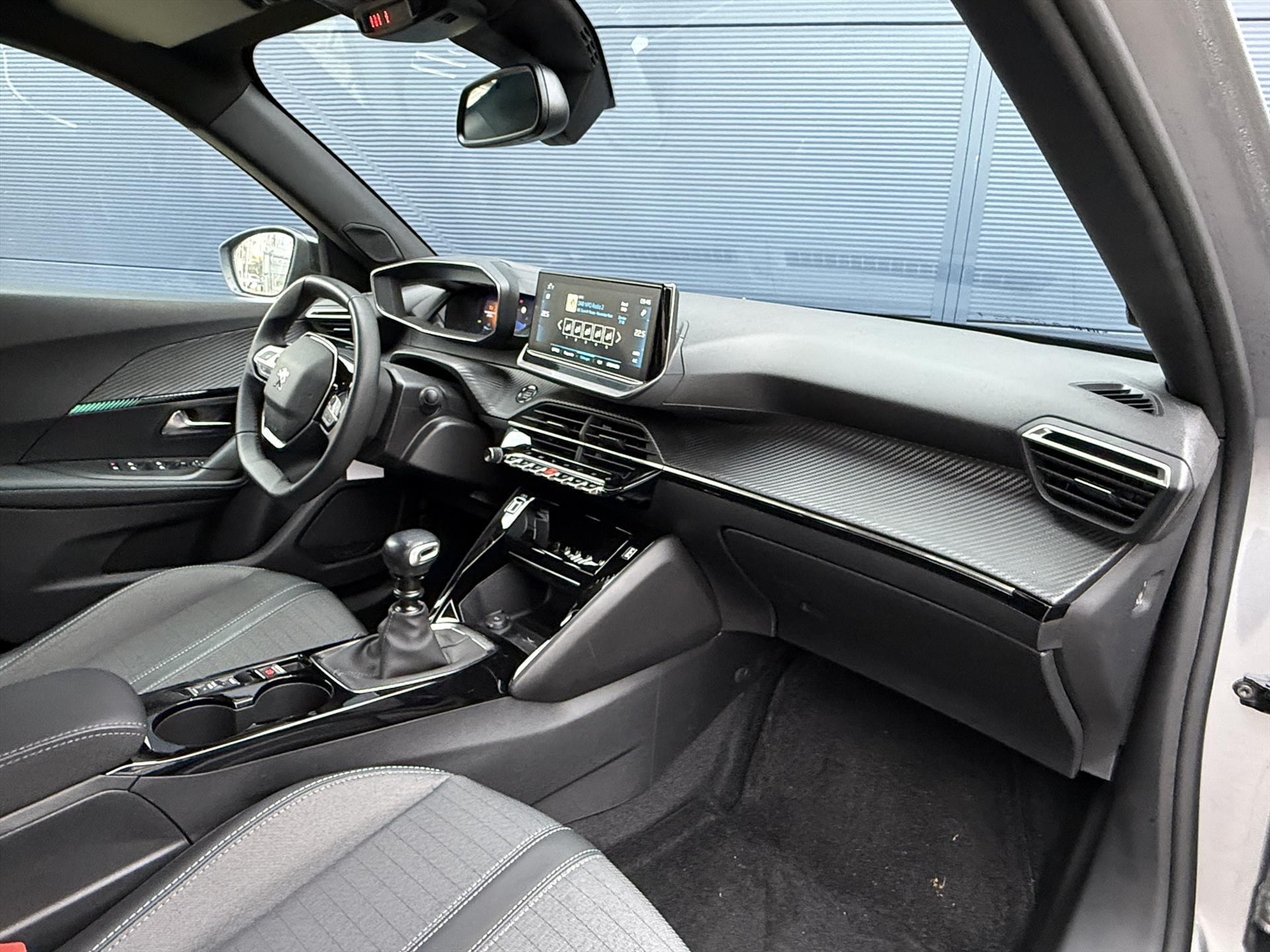 Dashboard in zacht materiaal met carboneffect en hoogglans zwarte sierstrip