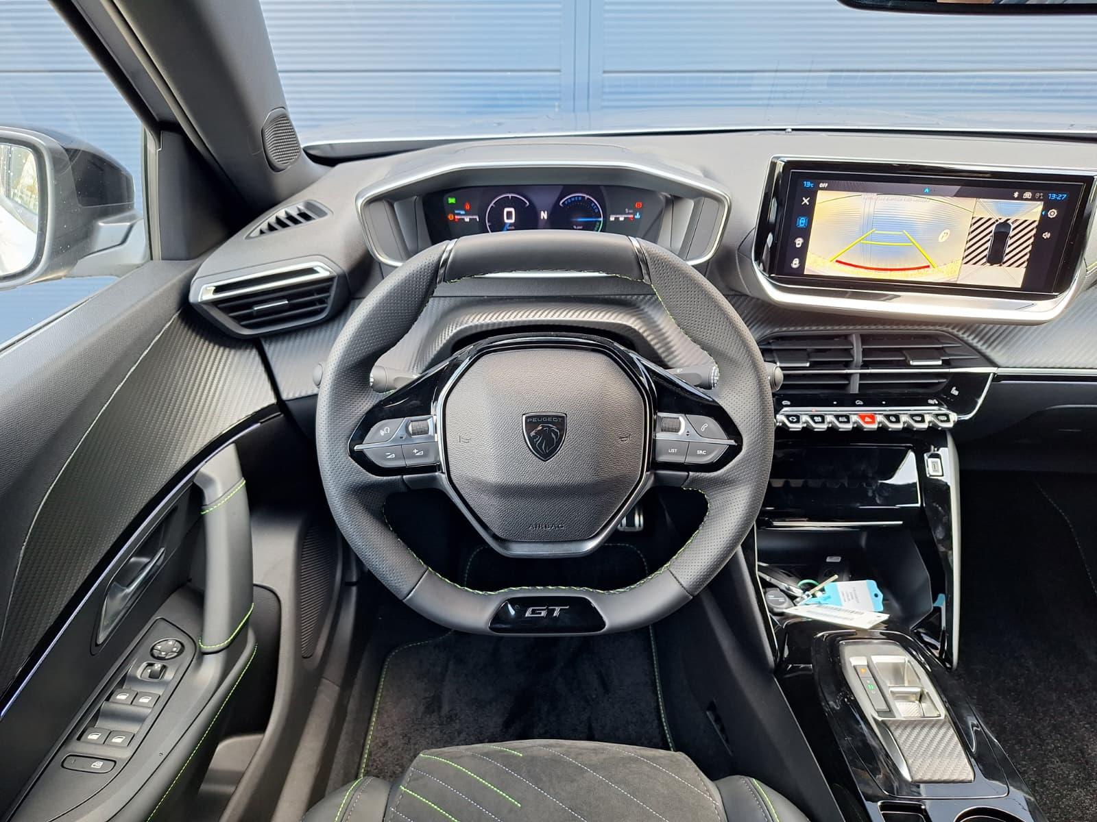 Sportstuurwiel afgewerkt met geperforeerd leder, groen stiksel en GT-logo