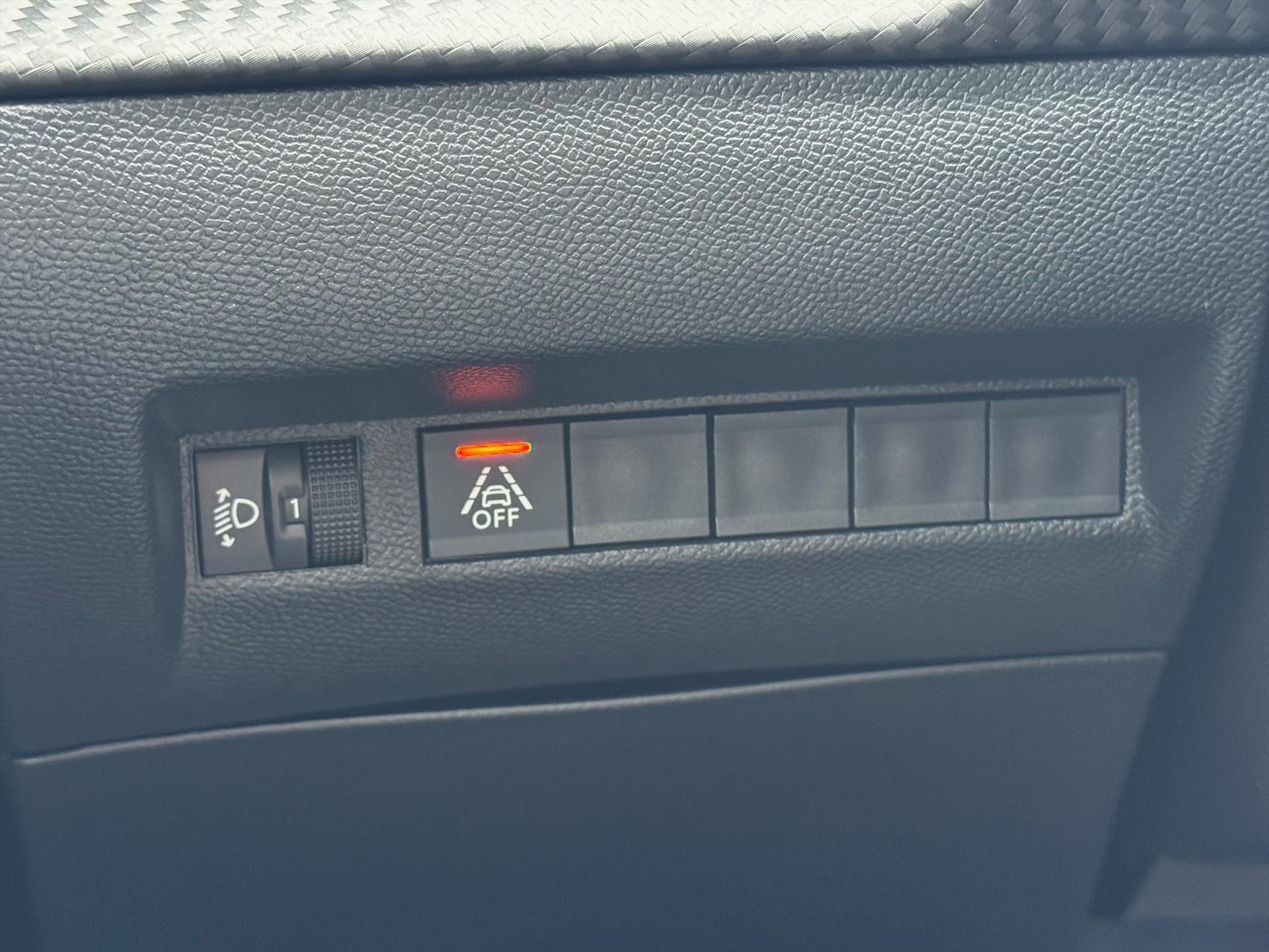 Dashboard in zacht materiaal met carboneffect en hoogglans zwarte sierstrip met chromen bies