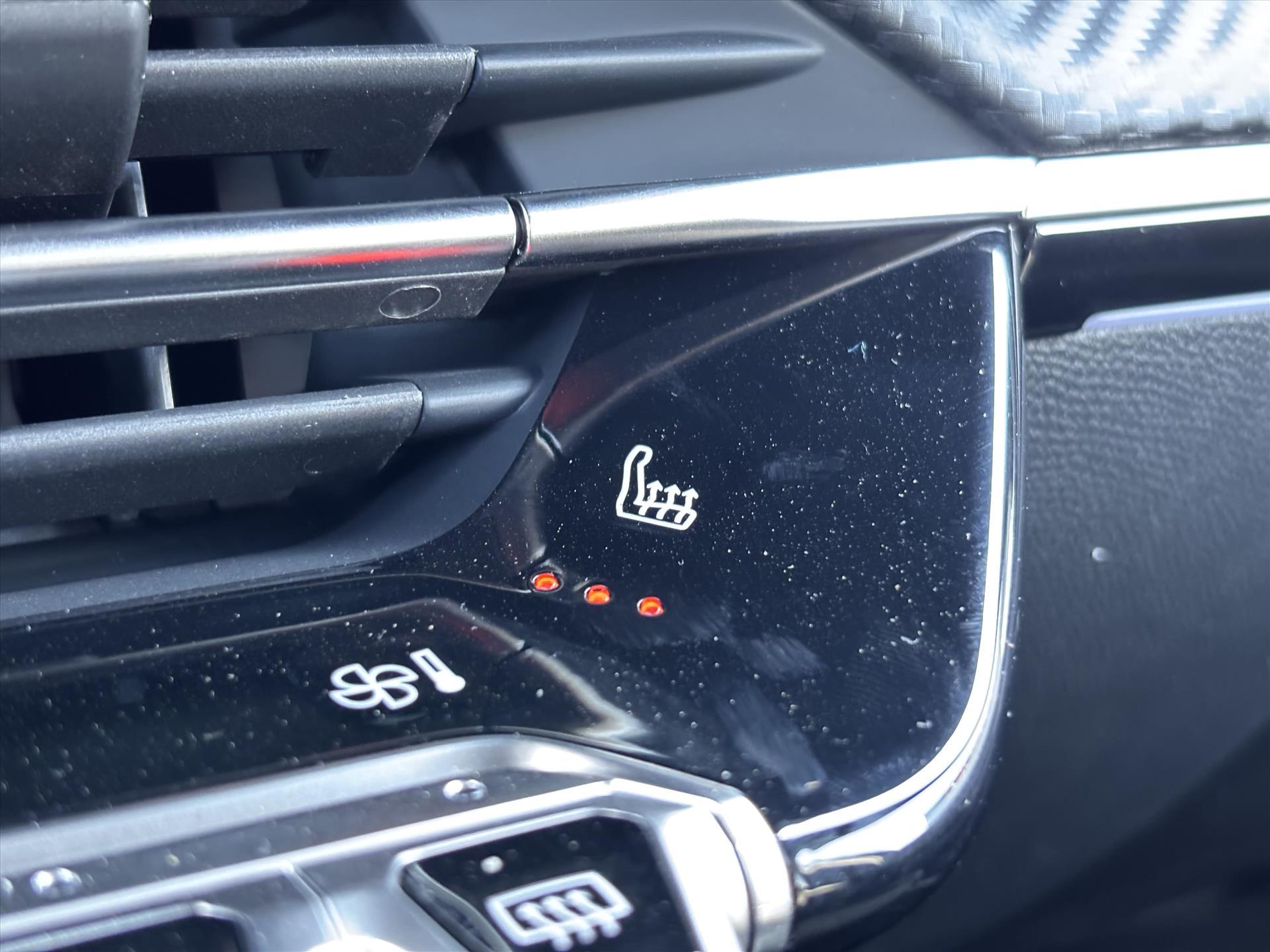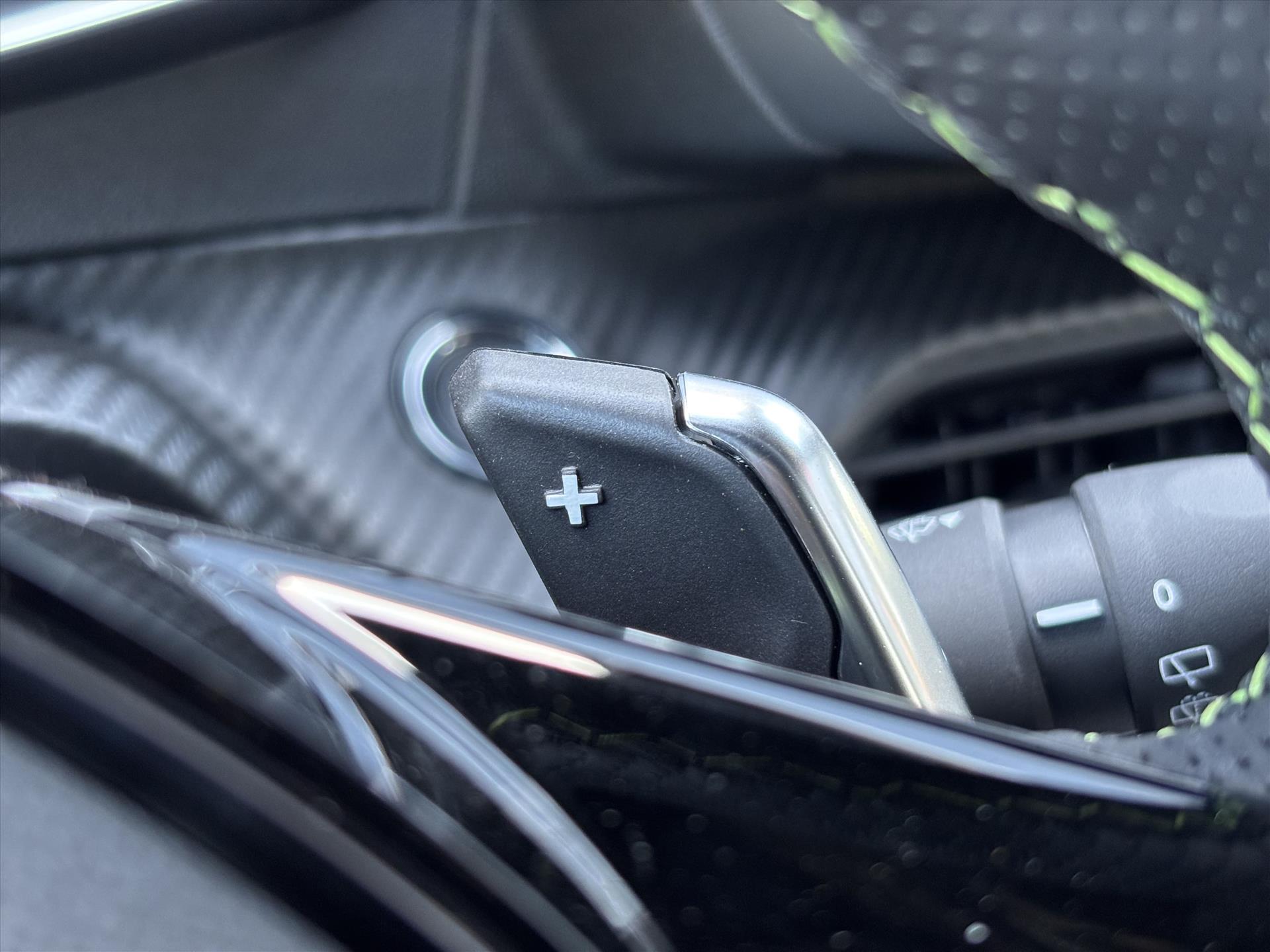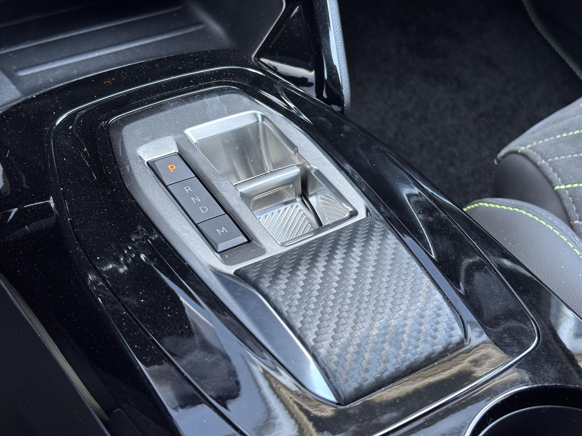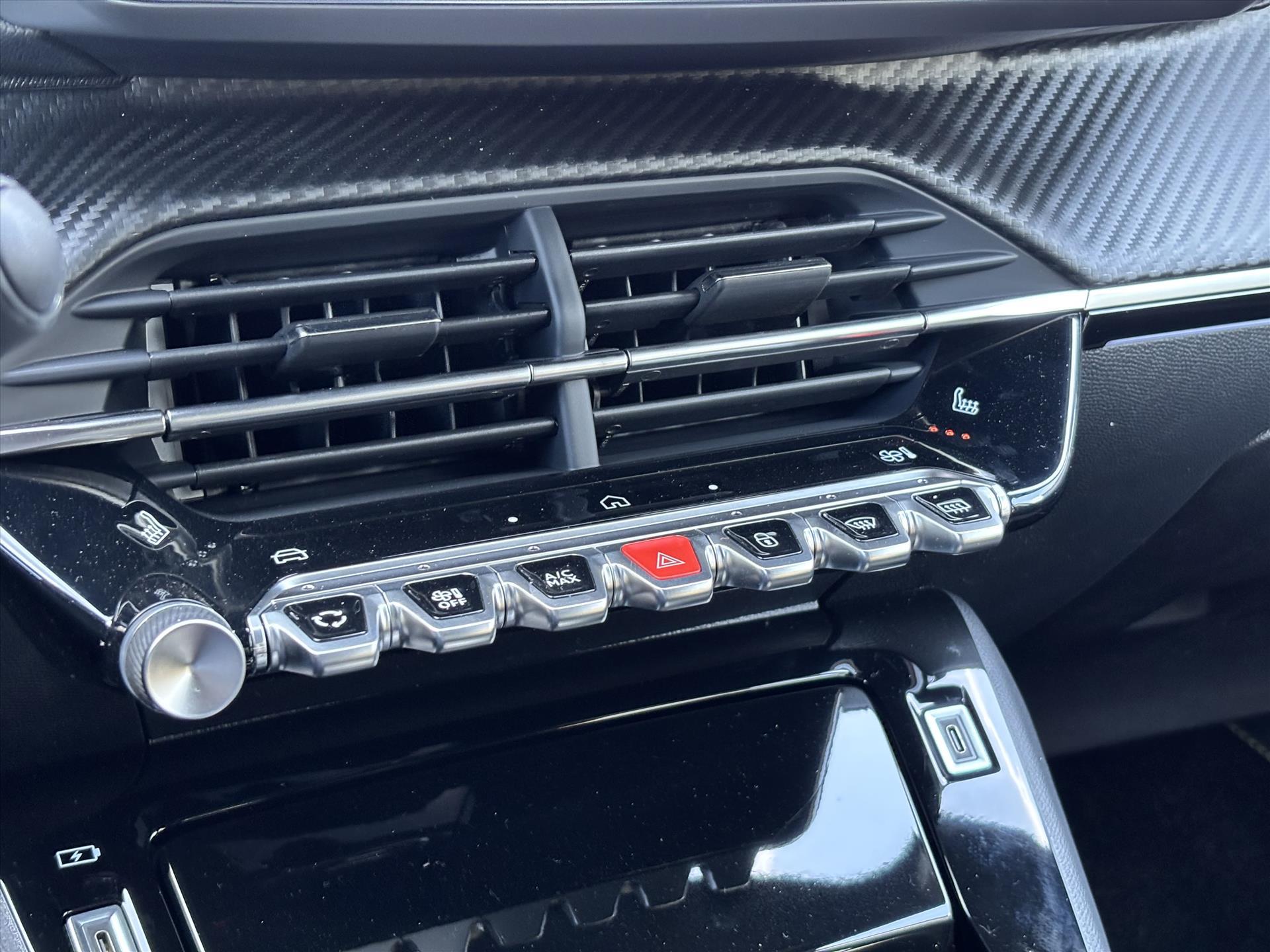 Dashboard in zacht materiaal met carboneffect en hoogglans zwarte sierstrip met chromen bies