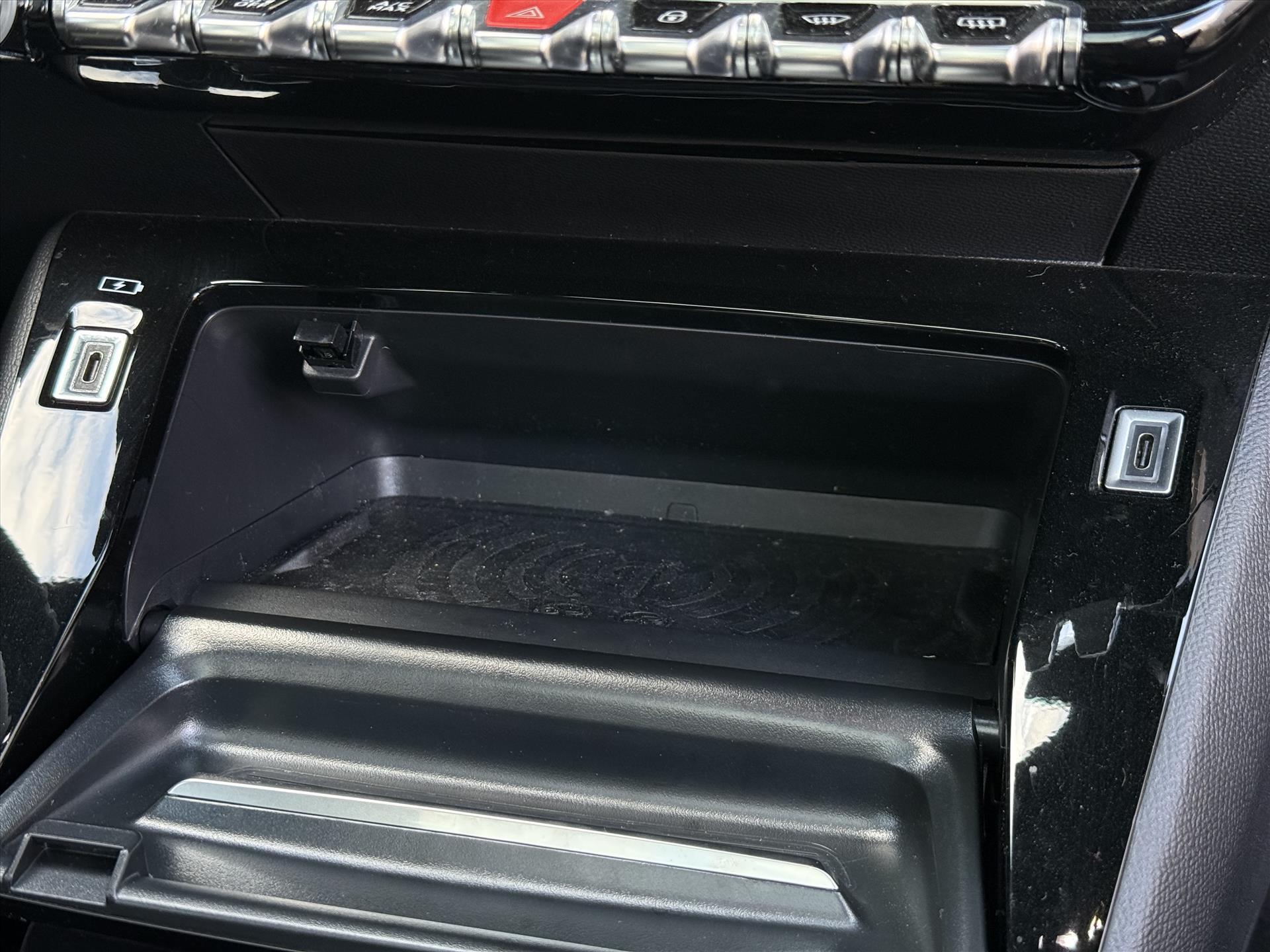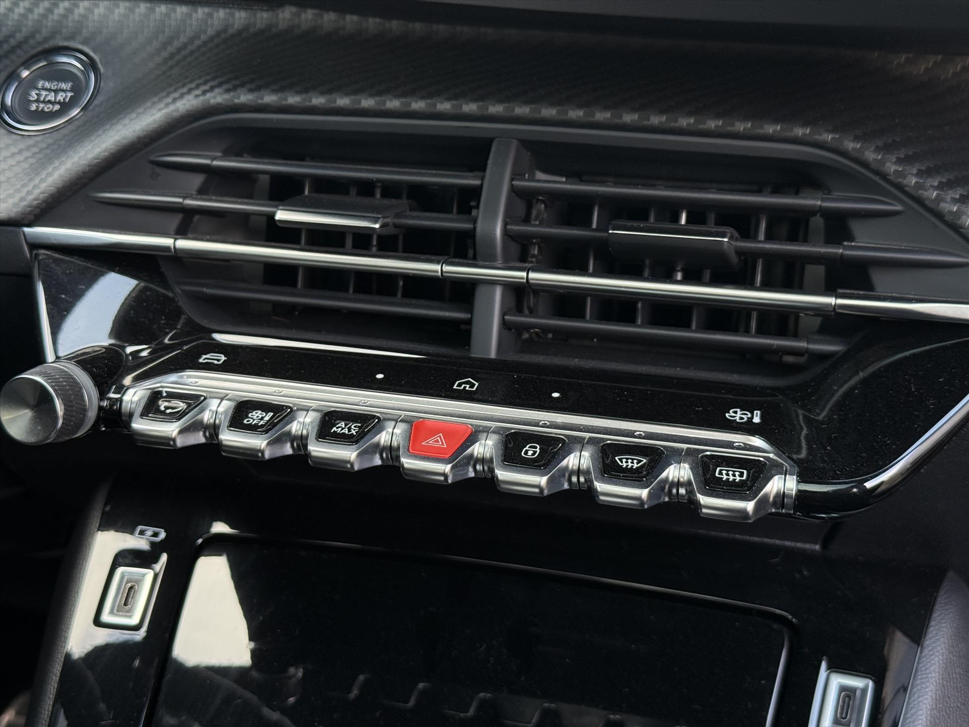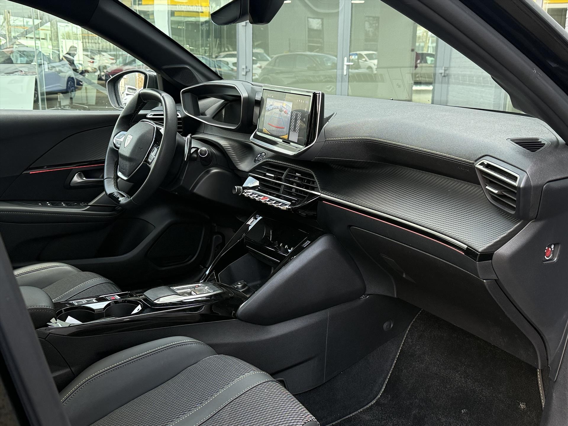 Dashboard in zacht materiaal met carboneffect en hoogglans zwarte sierstrip met chromen bies