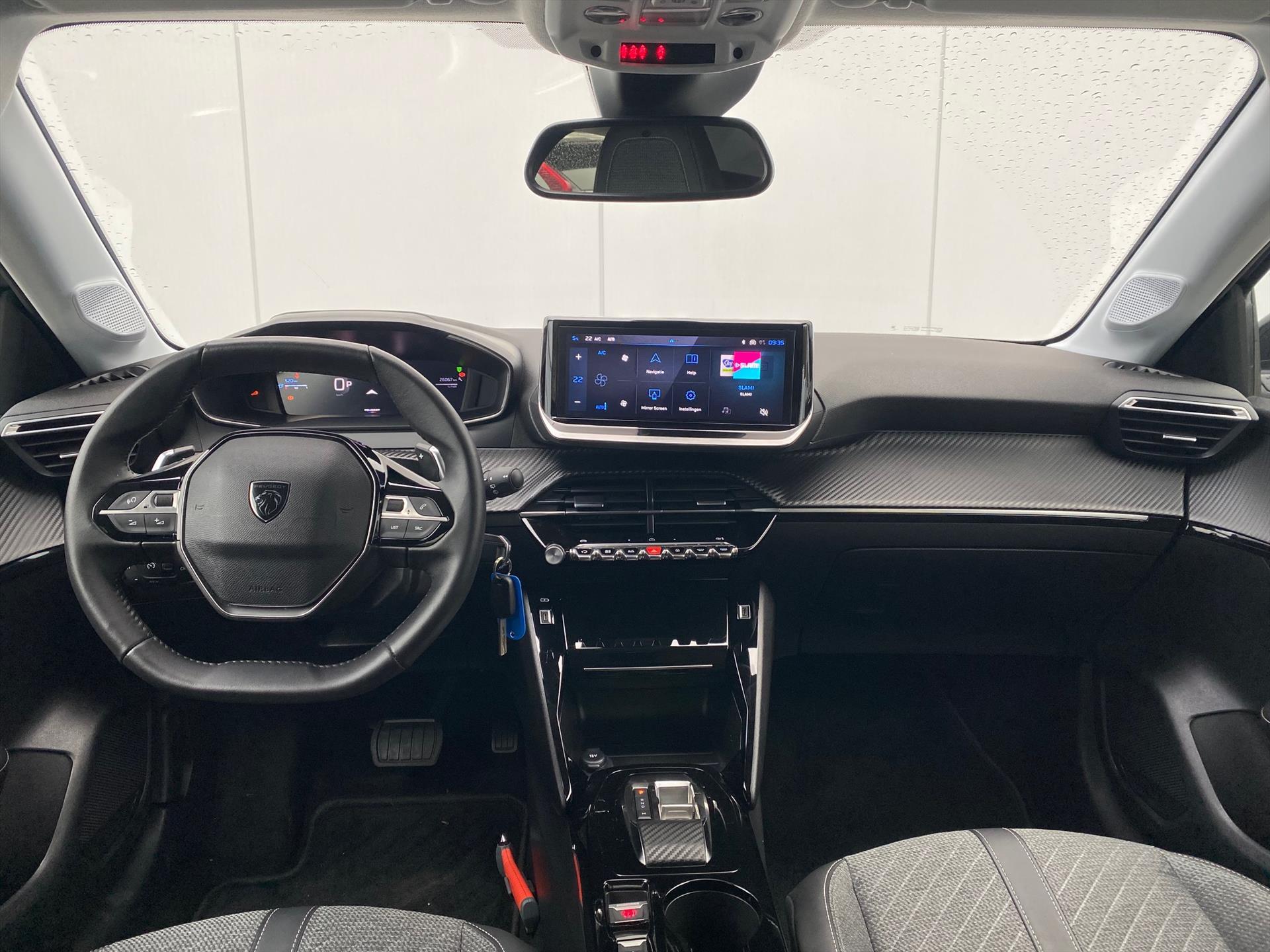 Dashboard in zacht materiaal met carboneffect en hoogglans zwarte sierstrip met chromen bies