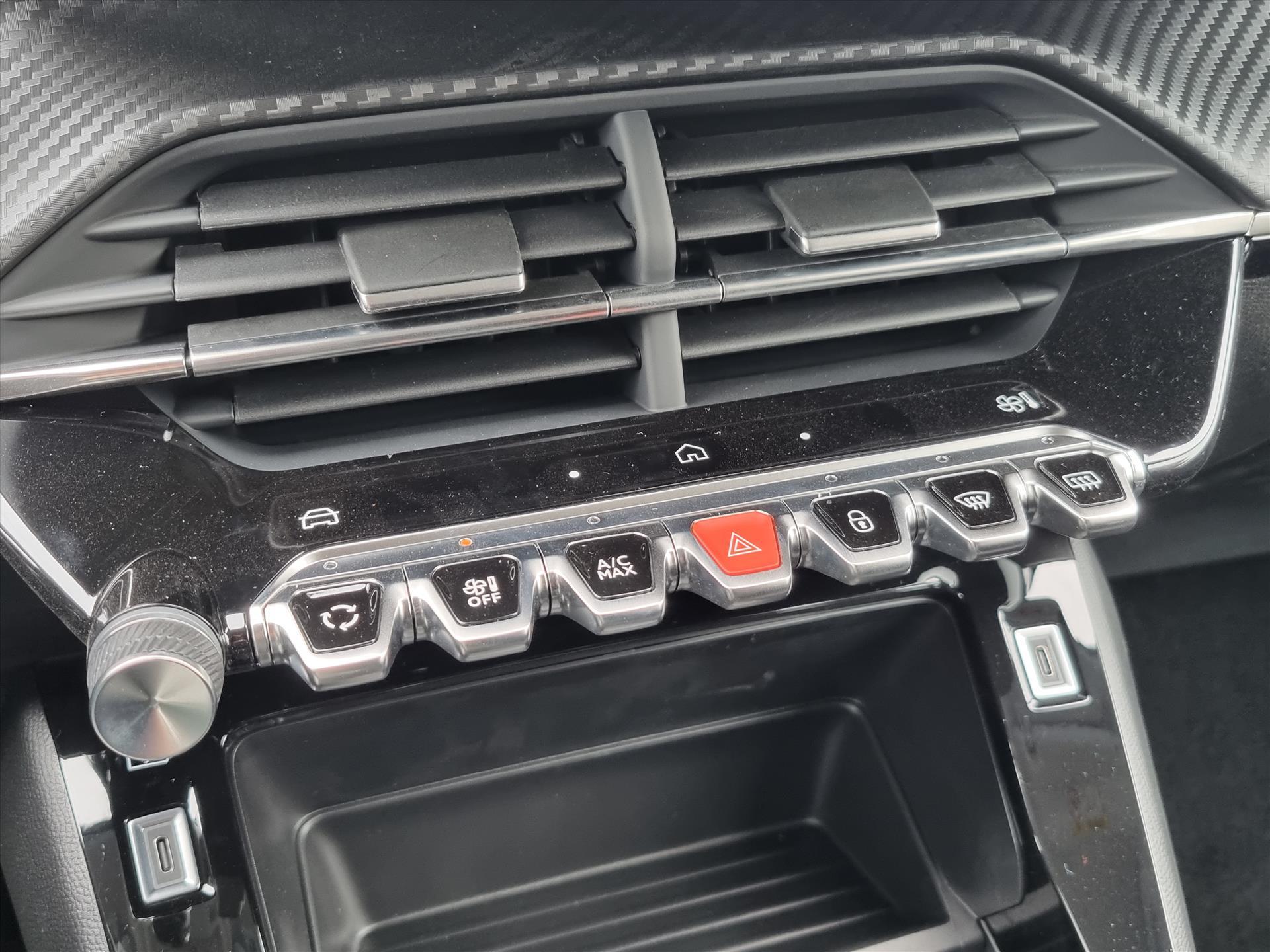 Dashboard in zacht materiaal met carboneffect en hoogglans zwarte sierstrip met chromen bies