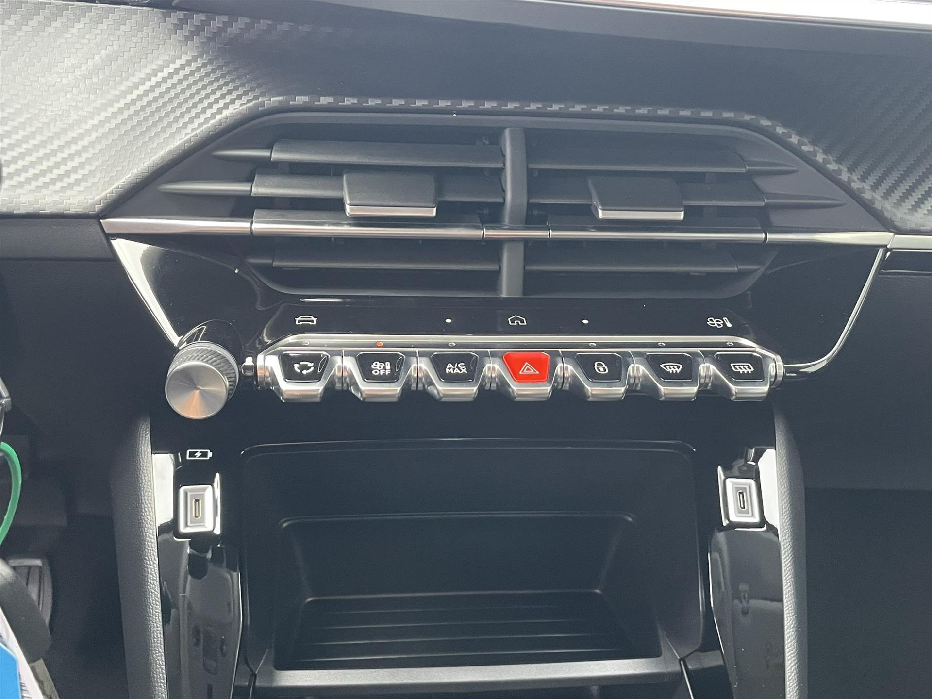Dashboard in zacht materiaal met carboneffect en hoogglans zwarte sierstrip met chromen bies