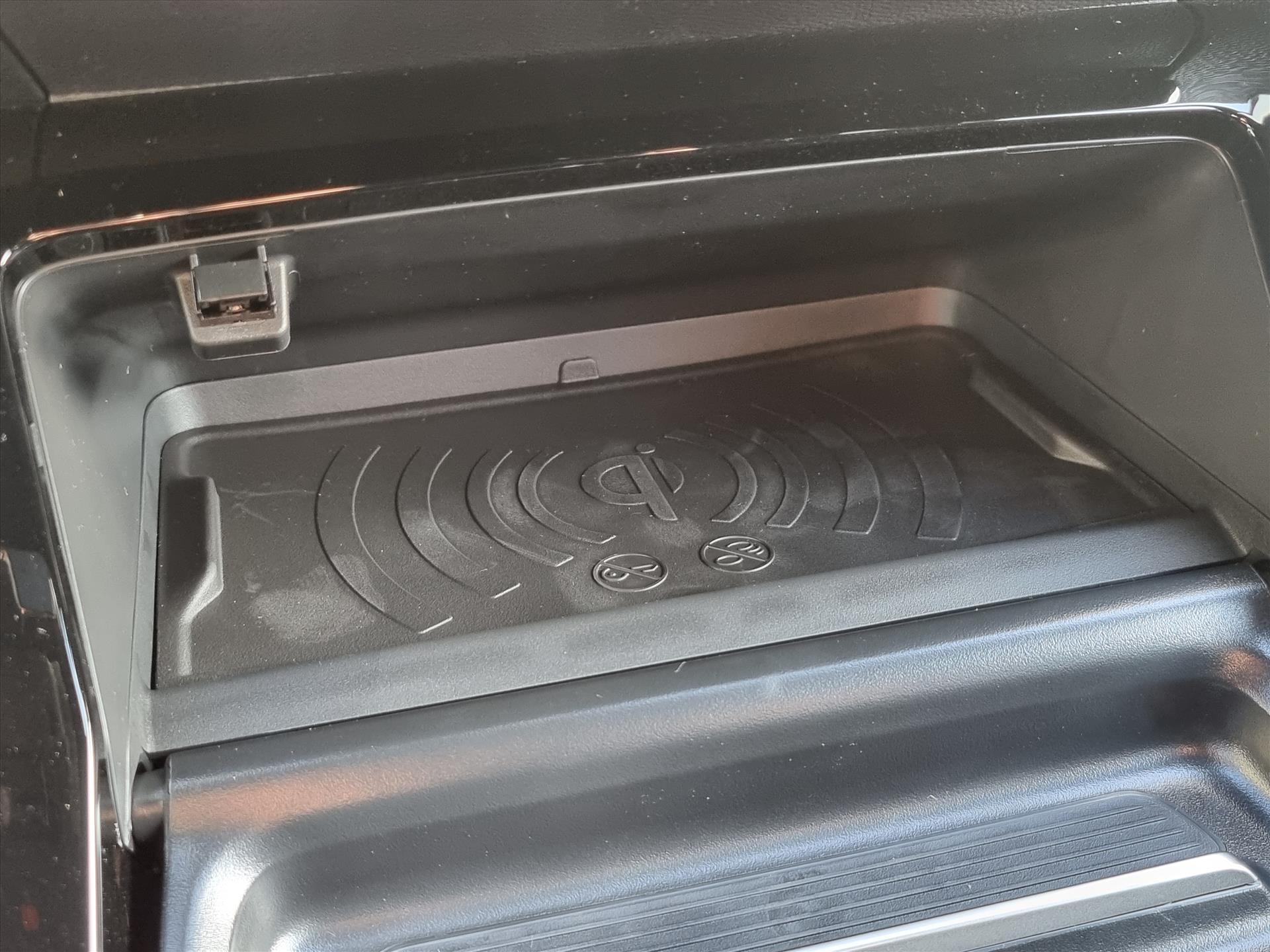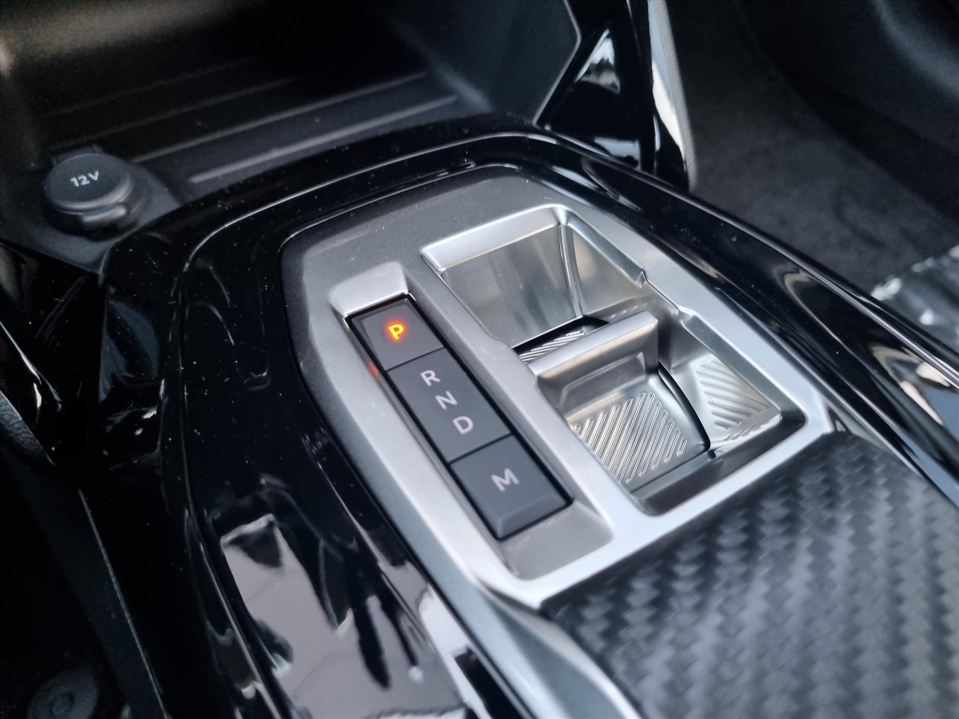 Dashboard in zacht materiaal met carboneffect en hoogglans zwarte sierstrip met chromen bies