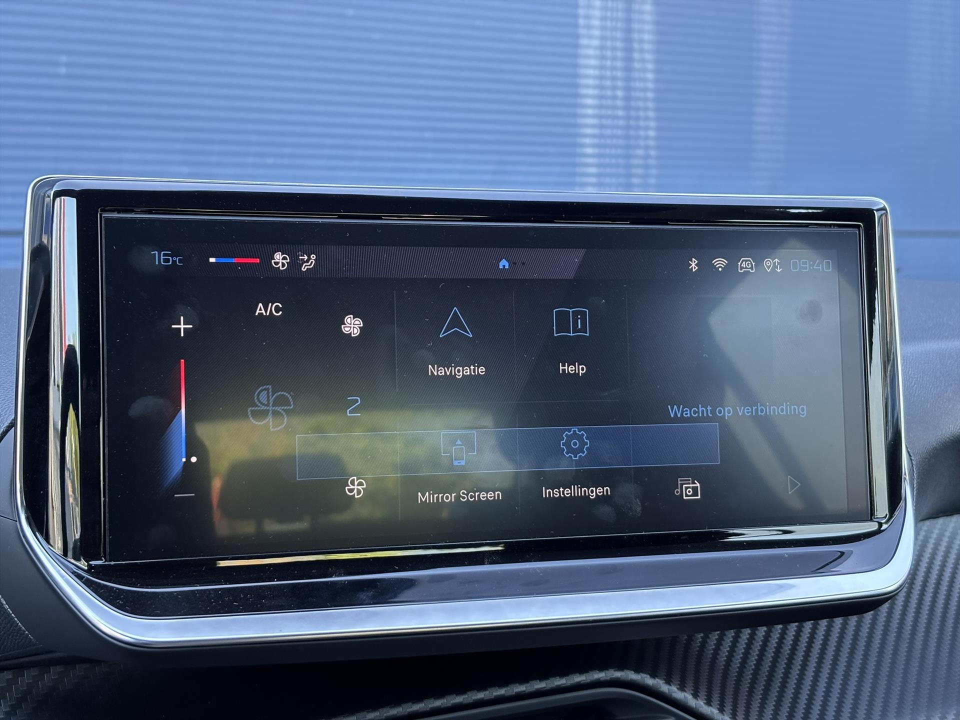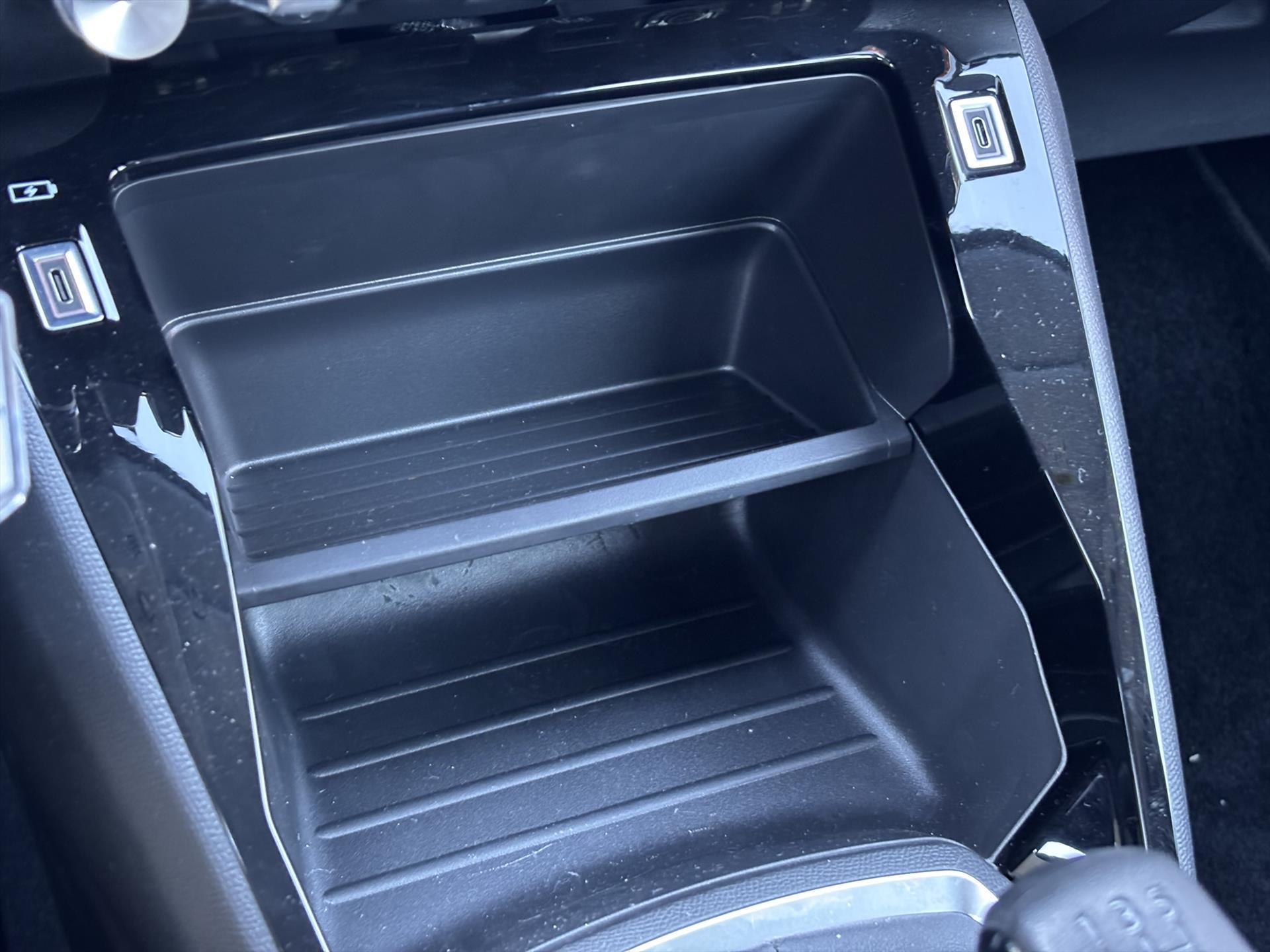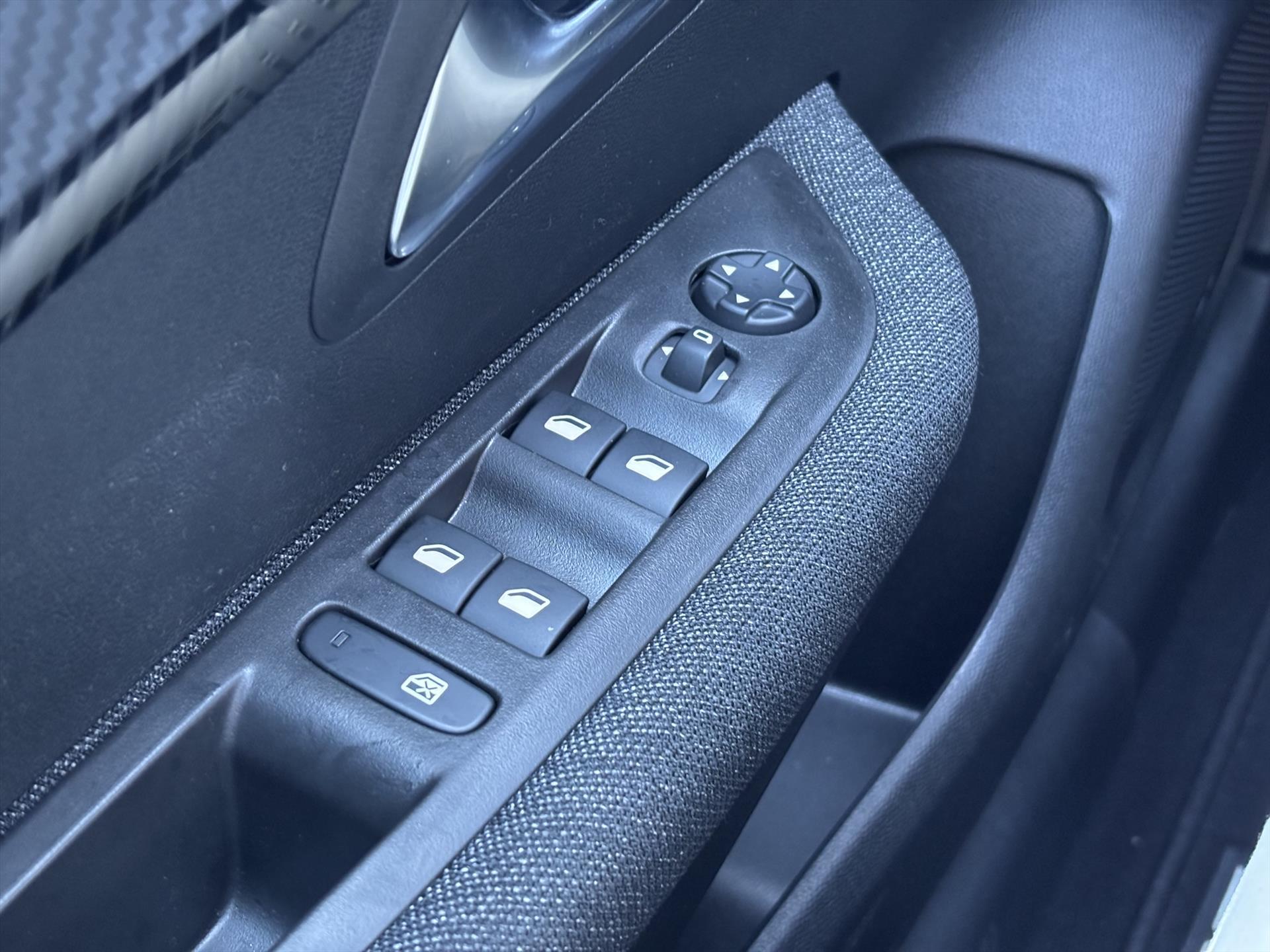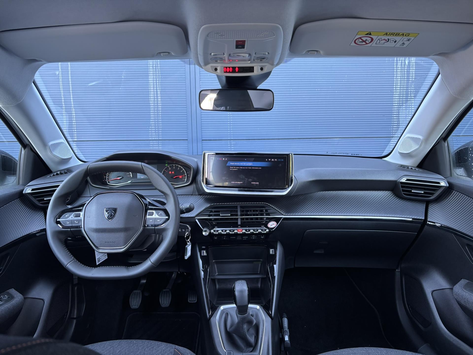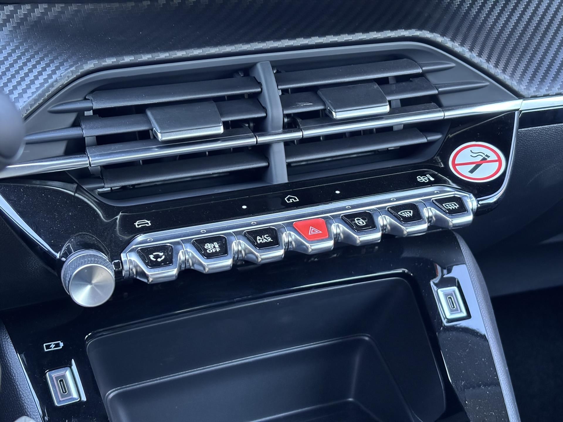 Dashboard in zacht materiaal met carboneffect en hoogglans zwarte sierstrip met chromen bies