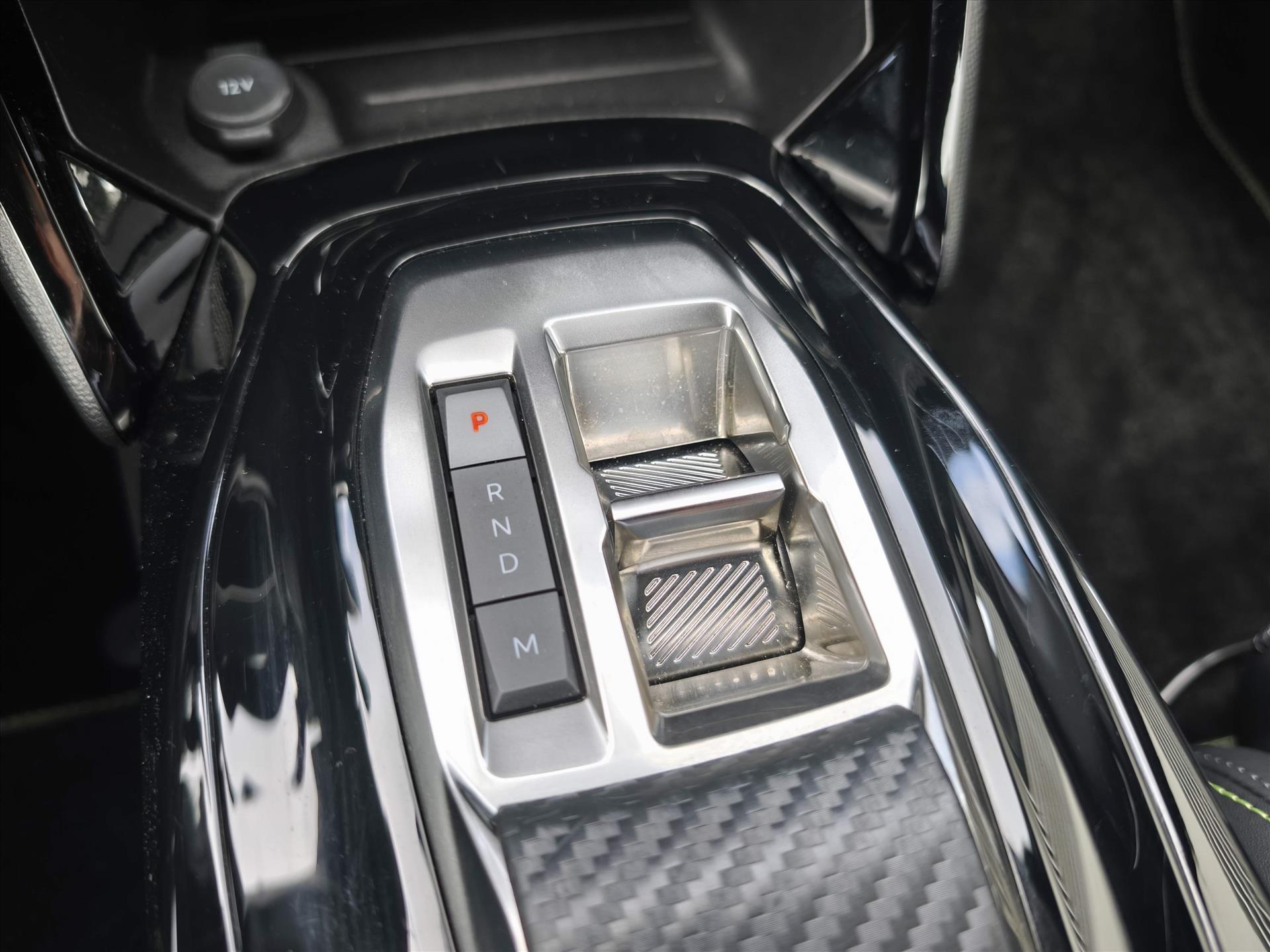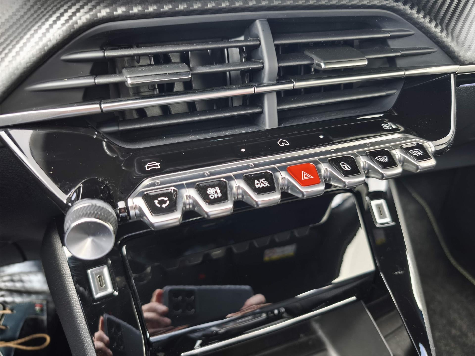 Dashboard in zacht materiaal met carboneffect en hoogglans zwarte sierstrip met chromen bies