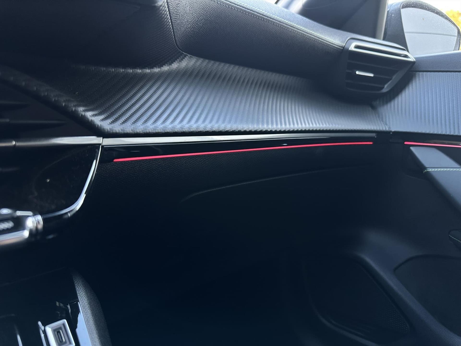 Dashboard in zacht materiaal met carboneffect en hoogglans zwarte sierstrip met chromen bies