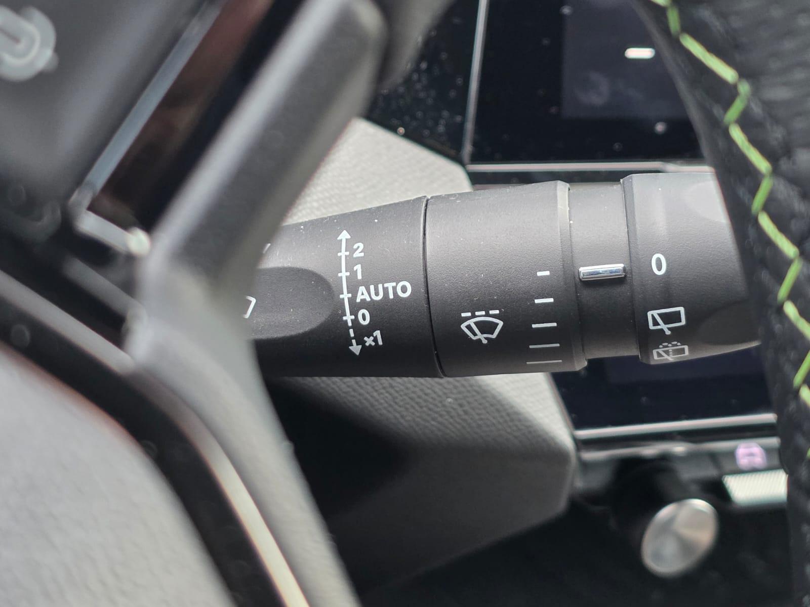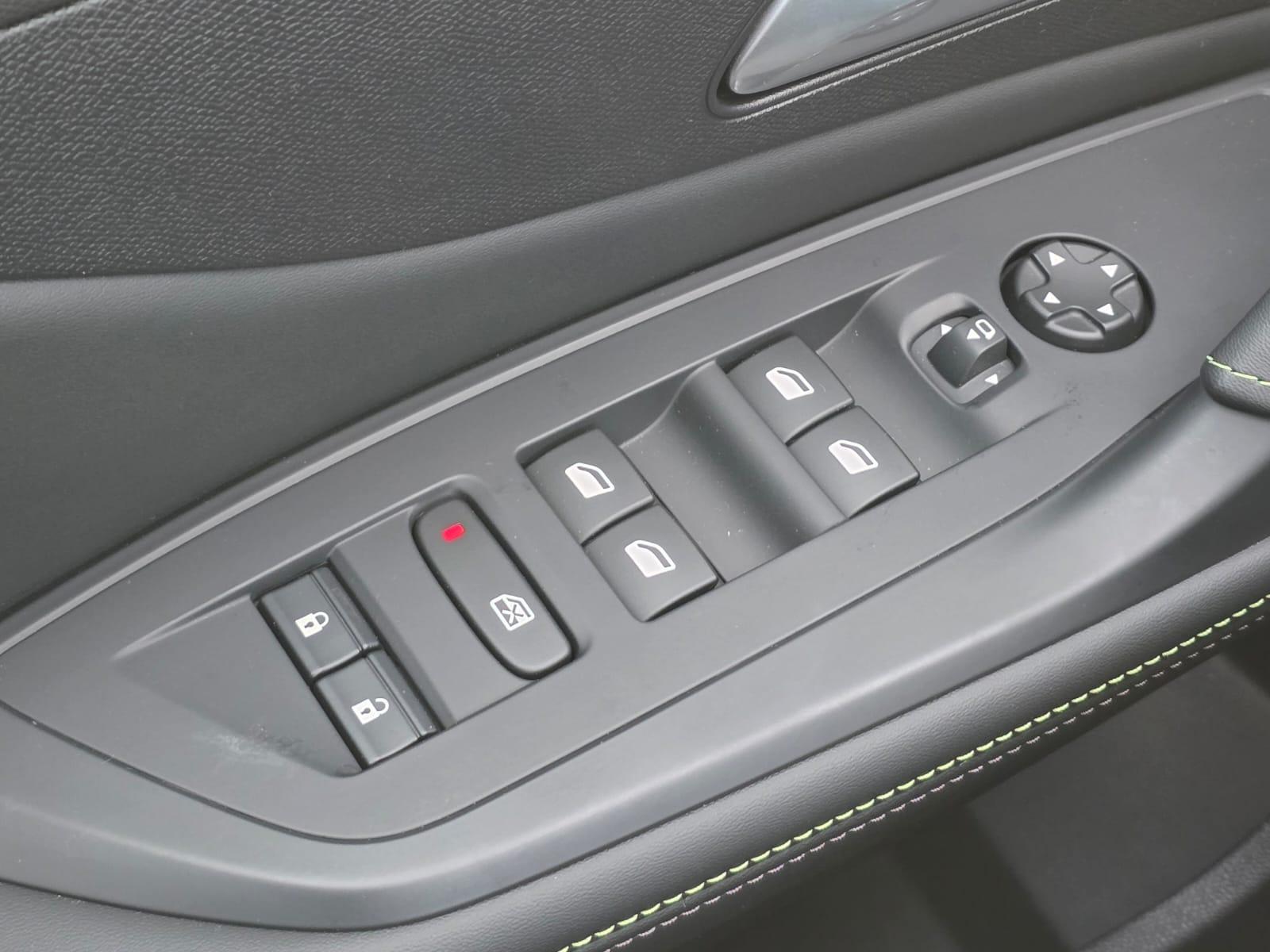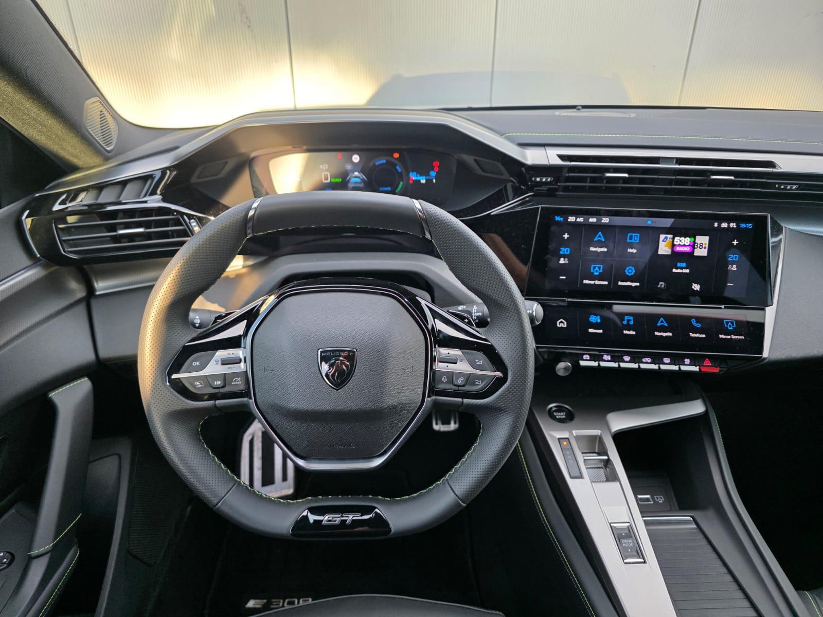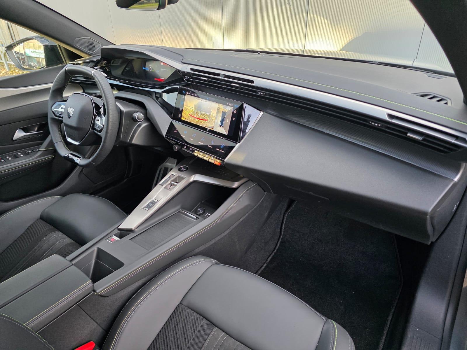 Dashboard, middenconsole en stuurwiel afgewerkt met groen stiksel