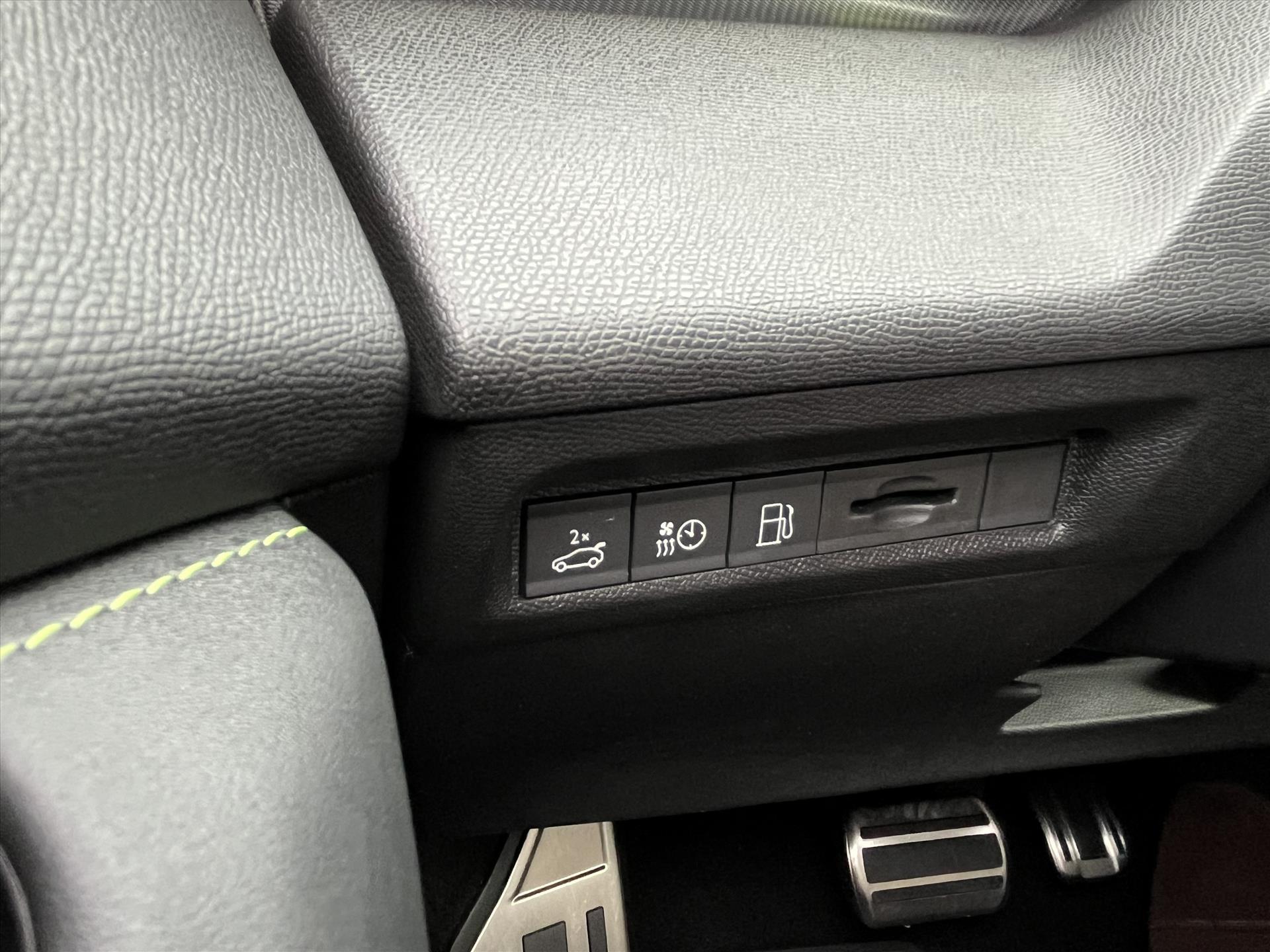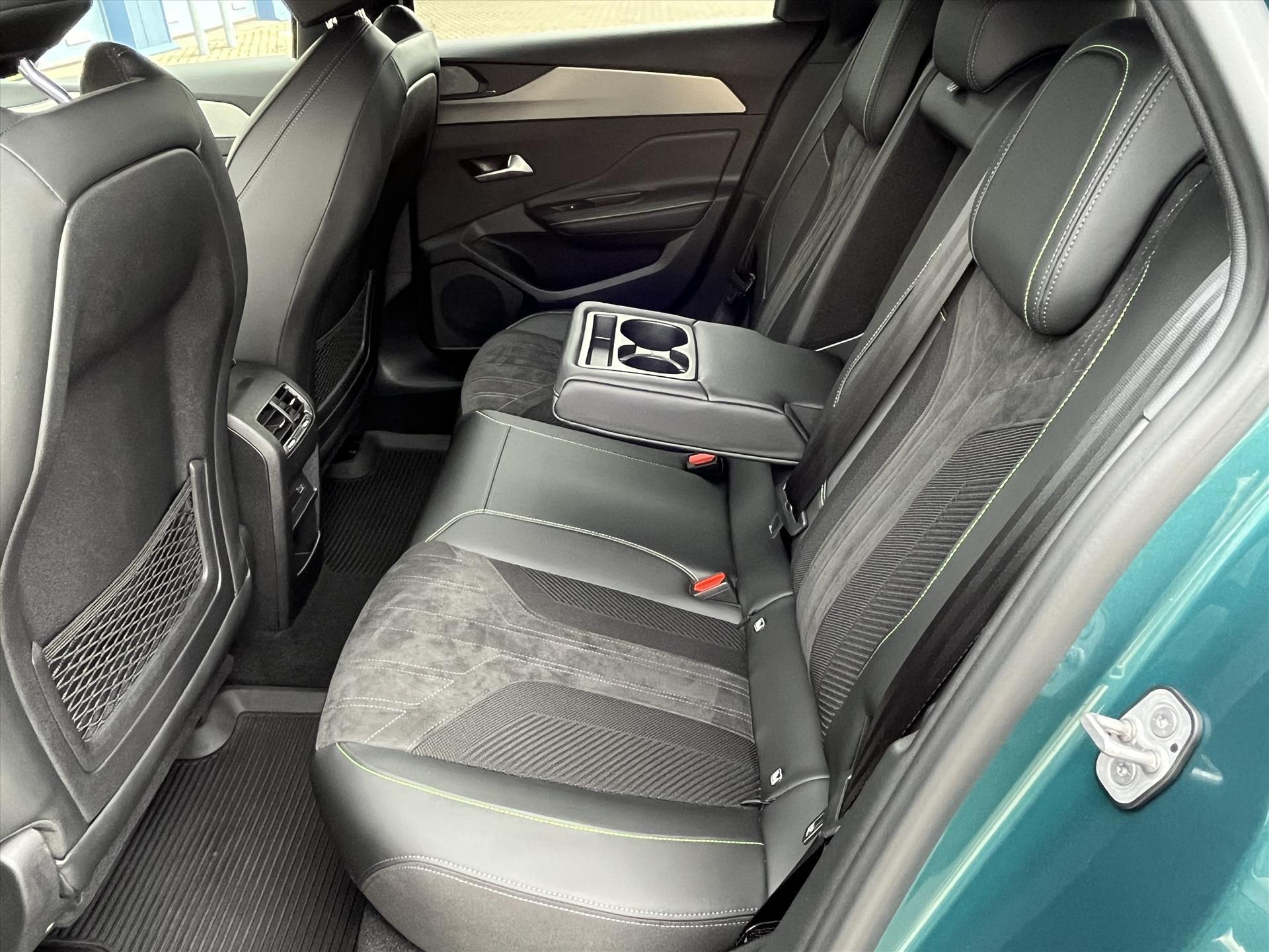 Dashboard, middenconsole en stuurwiel afgewerkt met groen stiksel