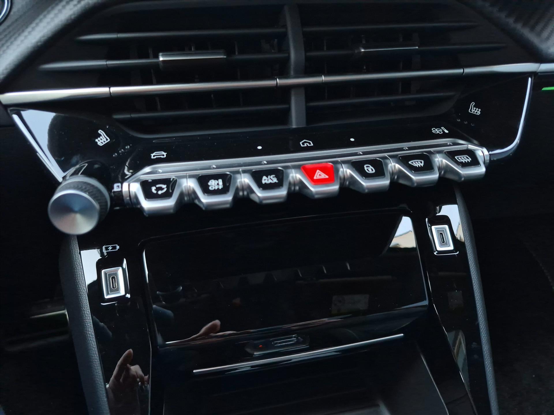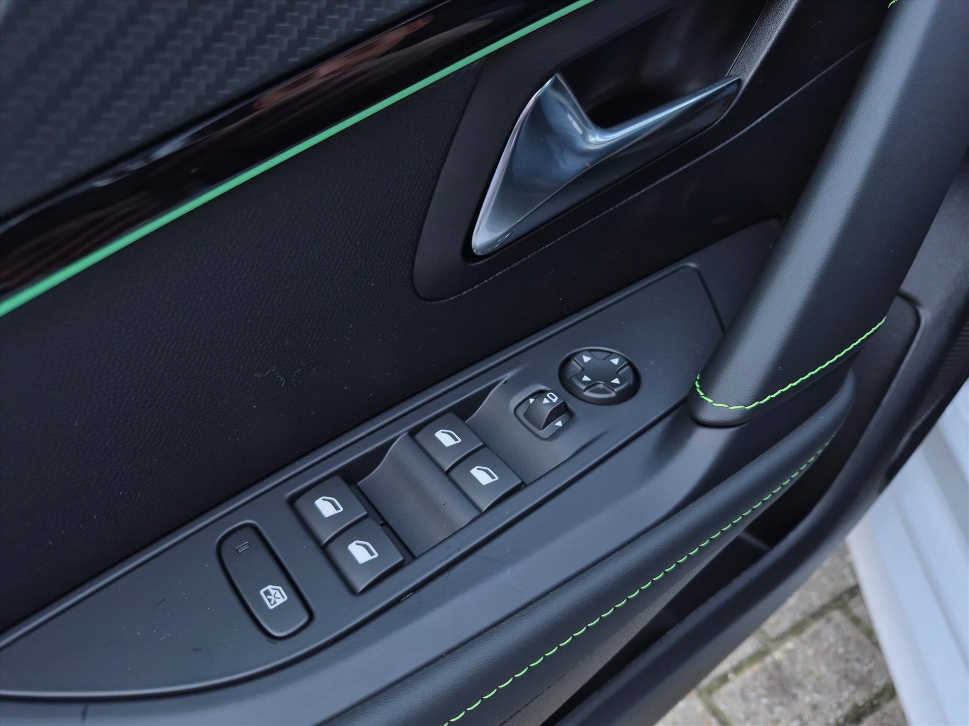 Dashboard in zacht materiaal met carboneffect en hoogglans zwarte sierstrip met chromen bies