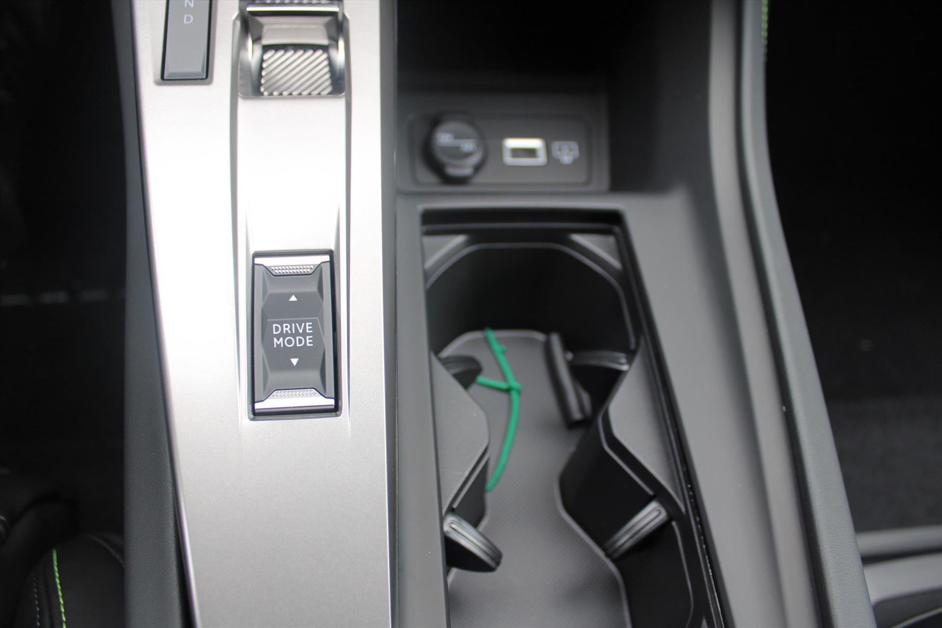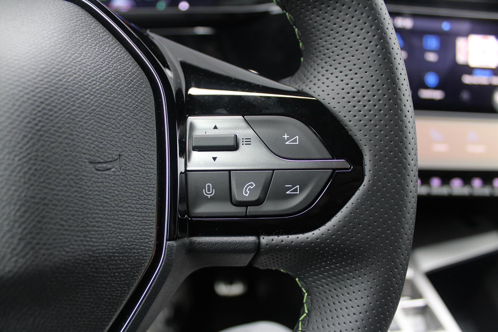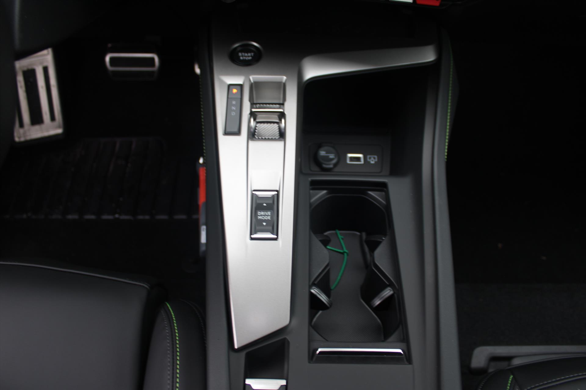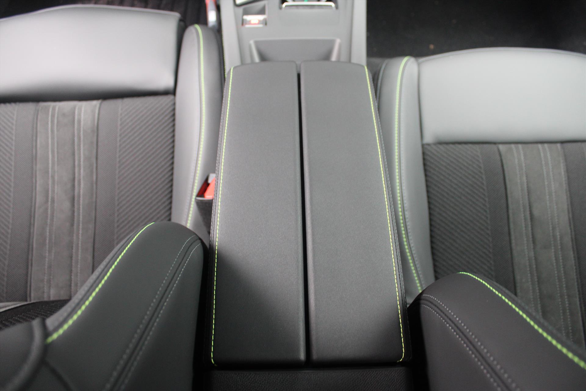 Dashboard, middenconsole en stuurwiel afgewerkt met groen stiksel